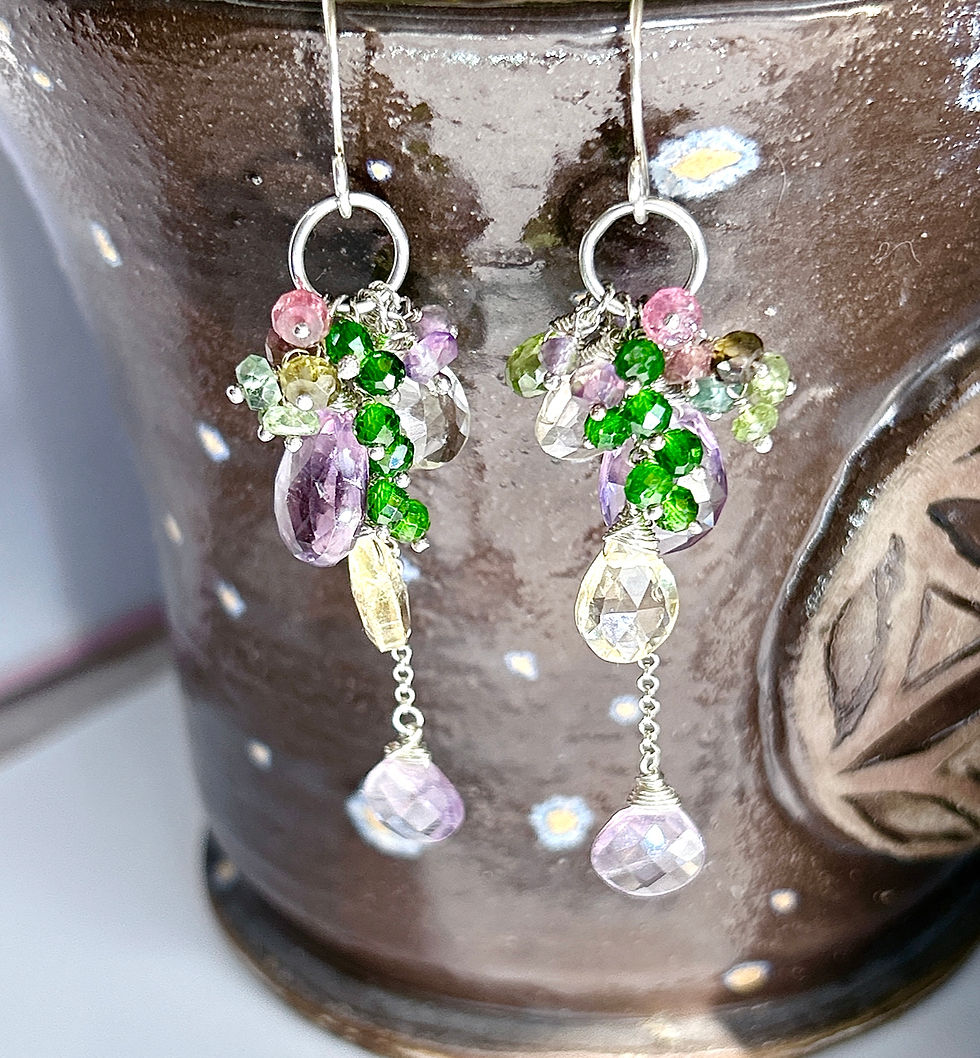 Pink amethyst earrings floral gemstone cluster with rosé quartz garnet peridot